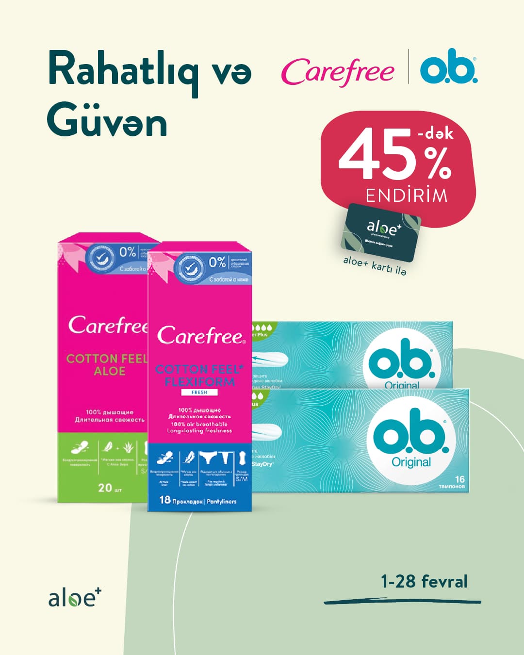 Carefree, O.B markalarının məhsullarını Aloe+ kartı ilə 45%-dək endirimlə əldə edə bilərsiniz!