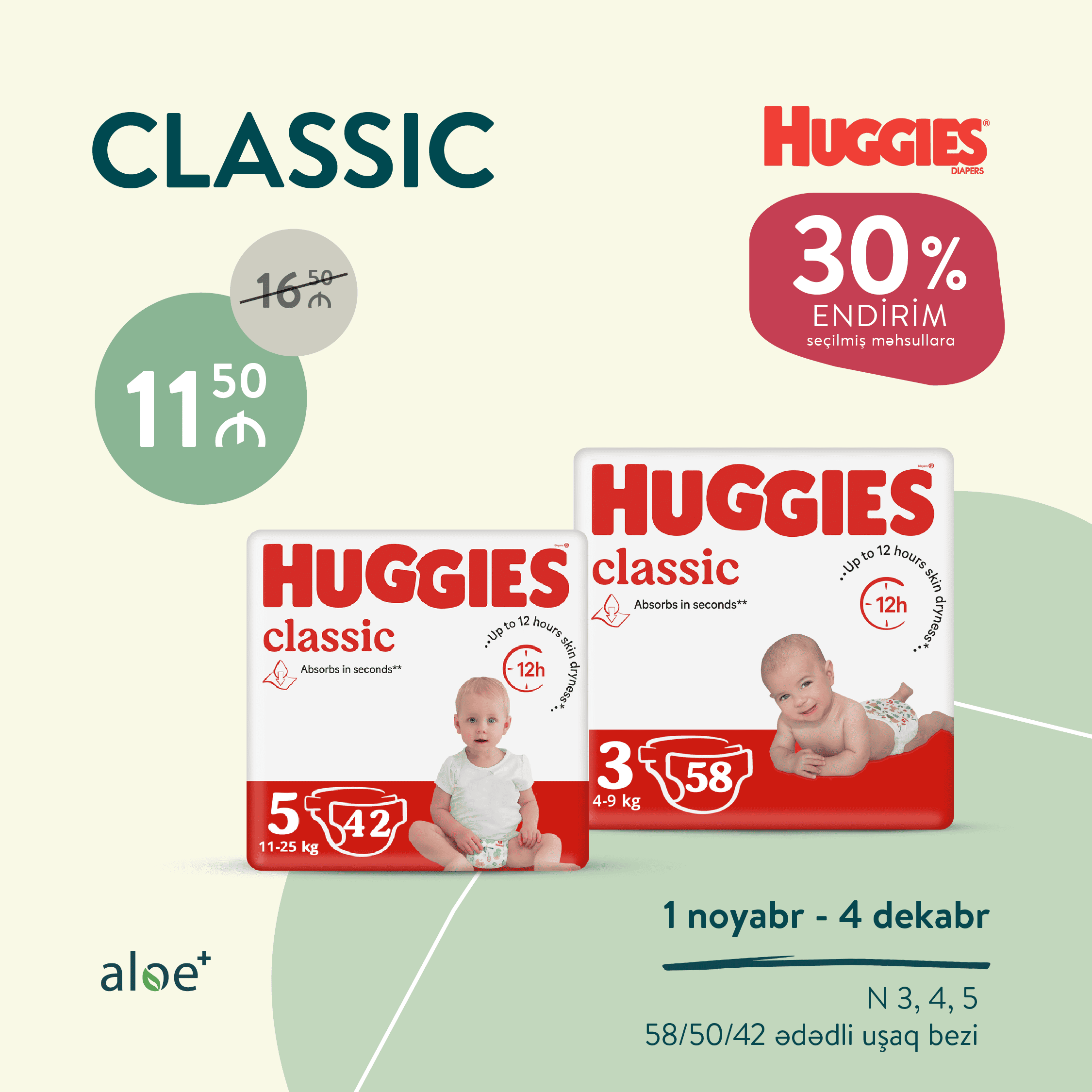 Aloe+💚apteki 1 noyabr - 4 dekabr  HUGGIES CLASSIC uşaq bezlərinin qiymətini 16.50 AZN-dən 11.50 AZN-ə endirdi!
